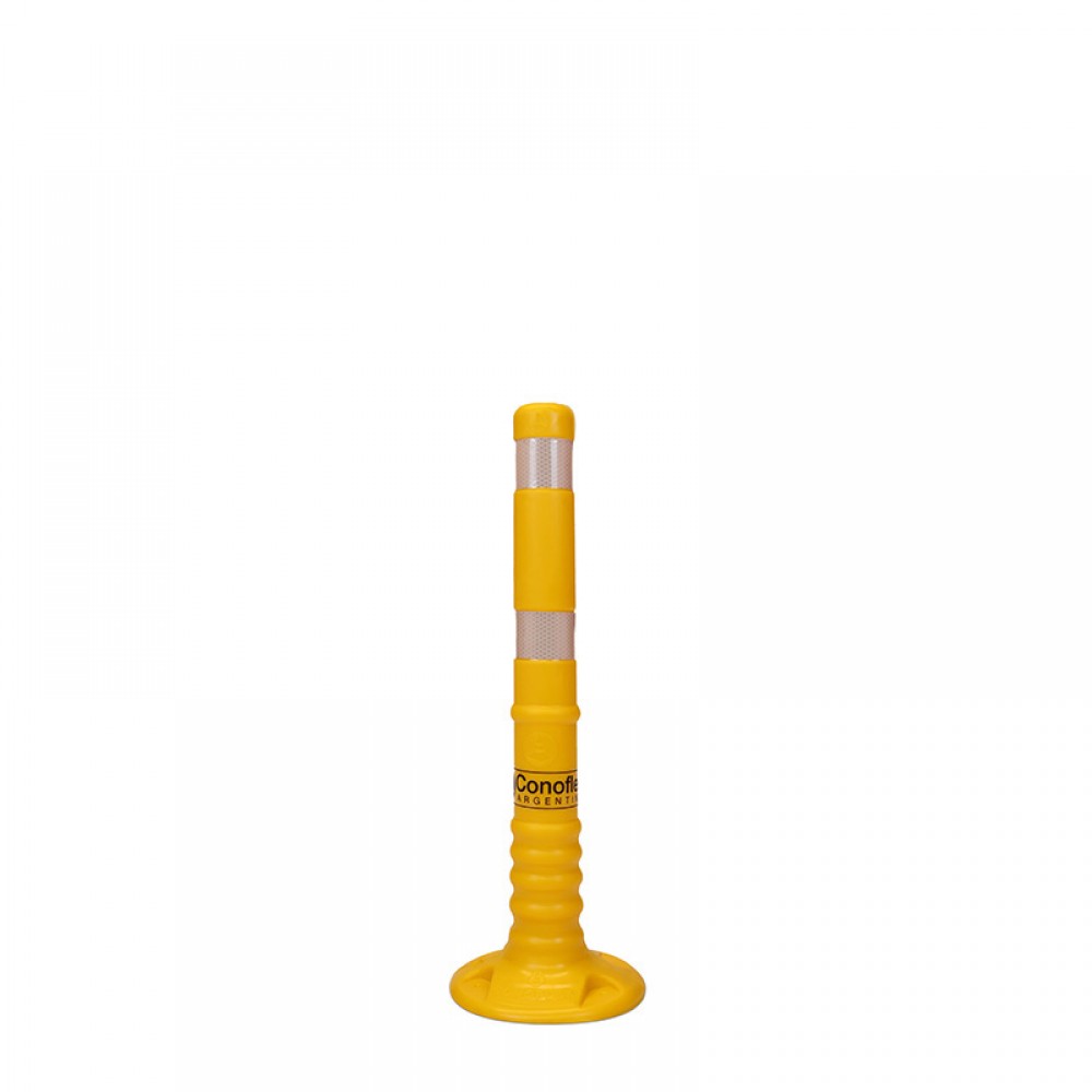 Delineador rebatible para demarcación vial, fabricado en material copolimero flexible, con filtro UV para protección solar. Conformado en “una sola pieza”. Altura 60 cm, diámetro de 5,5 cm y un peso de 1,3 kg. Su base de apoyo tiene un diámetro de 20 cm, provista de 4 centros de mecha para fijación con anclaje mecánico al suelo. Presenta 2 bandas reflectivas de 5 cm de ancho cada una, con características HIP (HIGH INTENSITY PRISMATIC) según normas IRAM ASTM D4956 Tipo-3. Las mismas se encuentran bajo relieve para su mayor protección