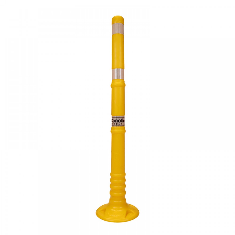 Delineador rebatible para demarcación vial, fabricado en copolímero flexible, con filtro UV para protección solar. Conformado en “una sola pieza”. Altura 90 cm, diámetro de 5,5 cm y un peso de 1,8 kg. Su base de apoyo tiene un diámetro de 20 cm, provista de 4 centros de mecha para fijación con anclaje mecánico al suelo. Presenta 3 bandas reflectivas de 5 cm de ancho cada una, con características HIP (HIGH INTENSITY PRISMATIC) según normas IRAM ASTM D4956 Tipo-3. Las mismas se encuentran bajo relieve para su mayor protección.
