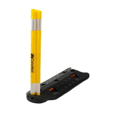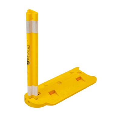 Delineador rebatible desmontable para demarcación vial, fabricado en copolimero flexible de 85 shore A de dureza, con filtro UV para protección solar. Conformado en 2 piezas. Medidas: 75 cm de altura. Estructura en forma T de 7,5 cm x 5,5 cm. Peso total 5,8 kgrs. Su base de apoyo fabricada en PVC, cuenta con 2 orificios para la sujeción del rebatible mediante 2 pernos plásticos de 10 cm de largo cada uno. Medidas de la base: 20 cm de ancho, 50 cm de Largo y 5 cm de alto. Su cabezal en forma circular permite radios de giro de hasta 30 Grados. Presenta 3 orificios para fijación al suelo con anclaje mecánico.
