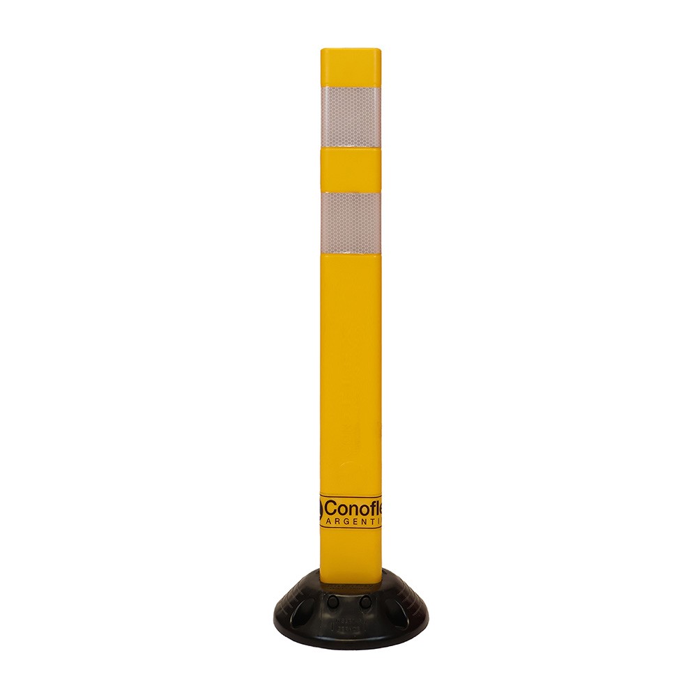 Delineador rebatible de forma T para demarcación vial, fabricado en material copolimero flexible, con filtro UV para protección solar. Conformado en “dos piezas”. Altura 75 cm, ancho de 8 cm y un peso de 1,3 kg. Su base de apoyo tiene un diámetro de 20 cm fabricada en material nylon, provista de 4 orificios para fijación con anclaje mecánico al suelo, cuenta con 2 orificios para la sujeción del rebatible, mediante 2 pernos plásticos de 10 cm cada uno. Presenta 2 bandas reflectivas de 7,5 cm de ancho cada una, con características HIP (HIGH INTENSITY PRISMATIC) según normas IRAM ASTM D4956 Tipo-3. Las mismas se encuentran bajo relieve para su mayor protección.