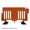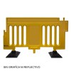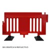 Valla plástica para seguridad vial, fabricada en material polietileno de media densidad, con filtro UV para protección solar. Está conformada en “3 piezas”, llamadas: Valla y Bases de Contrapeso. La valla tiene un total de 110 cm de alto y 190 cm de ancho, cuenta con un sistema de encastre a través de bisagras de Ø 4,5 cm de diámetro que le permiten giros de hasta 180º. Y 3 anclajes cuadrados de 6 cm, aptas para ser montadas en el canalizador YERSEY. La valla pesa 10 kg±0,2 kg. Las bases de contrapeso están conformadas en material PVC flexible color negro, de 60 cm x 30 cm y 12 cm de altura, con un peso de 7.5 kg cada una. El peso total de la valla con sus bases de contrapeso es de 25 kg±0,2 kg.