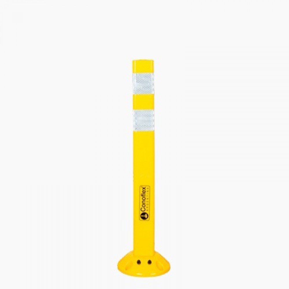 Delineador semirrigído de forma T para demarcación vial, fabricado en material copolimero semirrigido sin memoria, con filtro UV para protección solar. Conformado en “dos piezas”. Altura 75 cm, ancho de 7,5 cm y un peso de 1,3 kg. Su base de apoyo color negra tiene un diámetro de 20 cm fabricada en material nylon, provista de 4 orificios para fijación con anclaje mecánico al suelo, cuenta con 2 orificios para la sujeción del rebatible, mediante 2 pernos plásticos de 10 cm cada uno. Presenta 2 bandas reflectivas de 7,5 cm de ancho cada una, con características HIP (HIGH INTENSITY PRISMATIC) según normas IRAM ASTM D4956 Tipo-3. Las mismas se encuentran bajo relieve para su mayor protección. No incluye elementos de fijación al suelo.