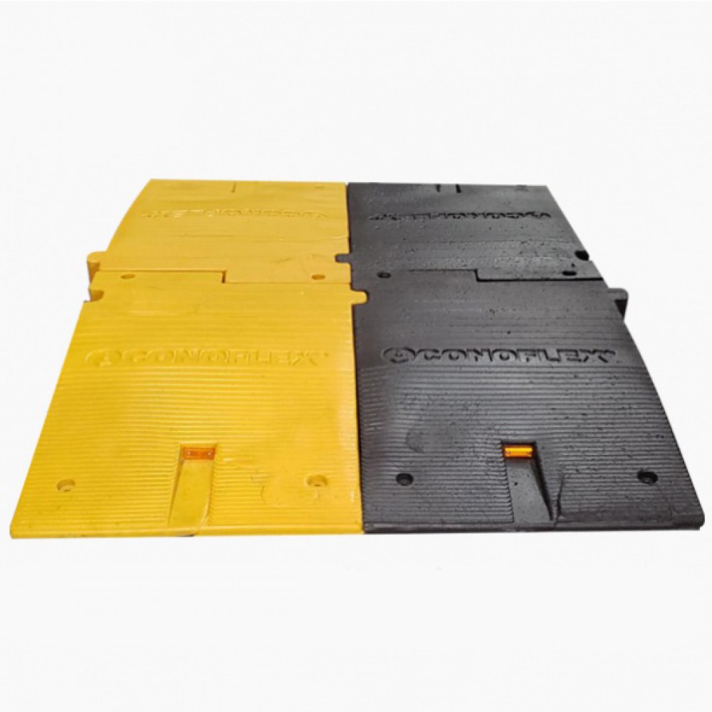 Reductor de velocidad, “TIPO LOMADA” fabricado con material PVC flexible macizo de dureza 90 shore A, con filtro UV para protección solar. Compuesto por 4 módulos de 50 x 75 cm y 8 cm de altura. Provisto por un sistema de encastre y 4 orificios por módulo para fijación con anclaje mecánico al suelo. Cada módulo posee 1 lente reflectivo acrílico prismático de 5 x 2 cm, el mismo se encuentra bajo profundidad para su protección. Su peso es de 80 kg x metro lineal y el largo de pisada es de 1,5 mt. “Para calles de doble sentido” solicitar lente acrílico prismático en ambas caras. Provisto de 12 pasacables ( 2 x Ø 0,2 cm - 2 x Ø 0,28 cm - 2 x Ø 0,35 cm - 2 x Ø 0,40 cm - 4 x Ø 0,55 cm ).