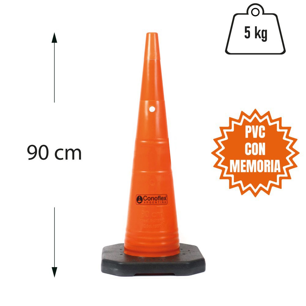 Cono de señalización vial de 90 cm de altura, fabricado en “una sola pieza” de PVC flexible con memoria. Color naranja vial, dureza 80 shore A, peso 5 kg±0,2 kg con filtro UV para protección solar. Base cuadrada maciza vulcanizada de color negro de 40 x 40 cm para una buena estabilidad.
