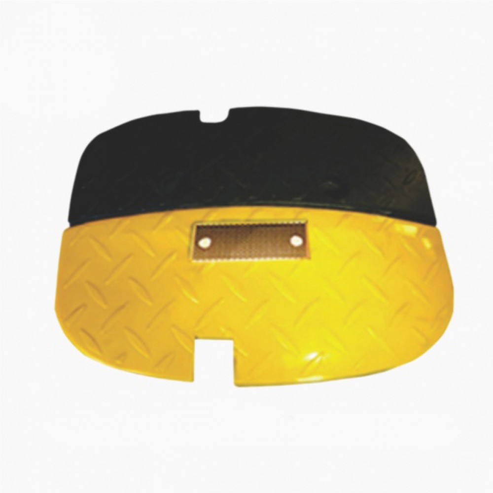 Tacha reductora semicircular, fabricada en material PVC flexible macizo de dureza 90 shore A, con filtro UV para protección solar. Medidas: 40 x 32 cm y 5,5 cm de altura. Compuesta por 2 módulos. Provista de un sistema de encastre y orificios para fijación con anclaje mecánico al suelo. Cuenta con un lente reflectivo acrílico prismático de 5 x 2 cm, el mismo se encuentra bajo profundidad para su protección. Su peso es de 4,5 kg. De fácil y rápida instalación.
