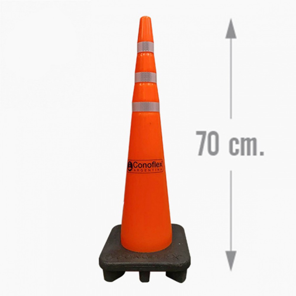 Cono de señalización vial de 70 cm de altura, fabricado en “una sola pieza” de PVC flexible con memoria. Color naranja vial, dureza 80 shore A, peso 3 kg±0,2 kg con filtro UV para protección solar. El diámetro mayor del cono es de 16 cm y 2,5 cm en su diámetro menor. Presenta 3 bandas reflectivas de 2,5 cm de ancho cada una, con características HIP (HIGH INTENSITY PRISMATIC) según normas IRAM ASTM D4956 Tipo-3. Las mismas se encuentran bajo relieve de 0,5 cm para su mayor protección. Base cuadrada maciza vulcanizada de color negro de 25 x 25 cm para una buena estabilidad y 8 patas de apoyo para su apilamiento sin enclavadura.