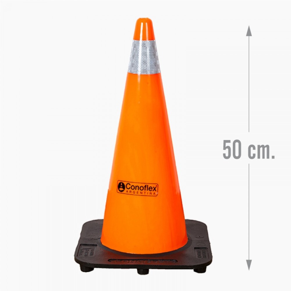 Cono de señalización vial de 50 cm de altura, fabricado en “una sola pieza” de PVC flexible con memoria. Color naranja vial, dureza 80 shore A, peso 2,5 kg±0,2 kg con filtro UV para protección solar. El diámetro mayor del cono es de 20 cm y 4 cm en su diámetro menor. Presenta 1 banda reflectiva de 10 cm de ancho, con características HIP (HIGH INTENSITY PRISMATIC) según normas IRAM ASTM D4956 Tipo-3. Base cuadrada maciza vulcanizada de color negro de 35 x 35 cm para una buena estabilidad y 8 patas de apoyo para su apilamiento sin enclavadura.