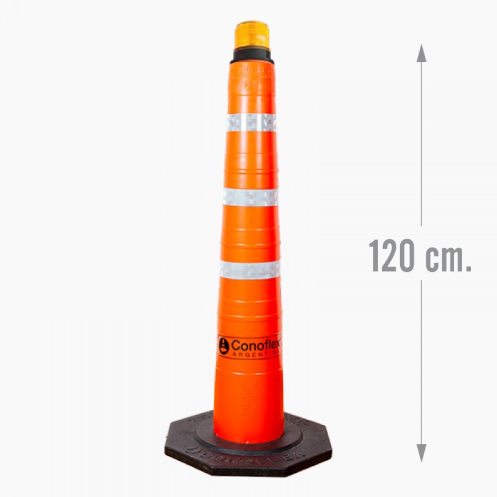 Cono de señalización vial de 120 cm de altura, fabricado en material polietileno semirrígido. Color naranja vial, con filtro UV para protección solar. Conformado en “2 piezas” llamadas: Cono y Base de Contrapeso. El diámetro mayor del cono es de 20 cm y 10 cm en su diámetro menor. Presenta 3 bandas reflectivas de 5 cm de ancho cada una, con características HIP (HIGH INTENSITY PRISMATIC) según normas IRAM ASTM D4956 Tipo-3. Las mismas se encuentran bajo relieve de 0,5 cm para su mayor protección. El cono sin su base de contrapeso, tiene un peso de 1,9 kg. Base de contrapeso: La base está fabricada en material PVC flexible de color negro, conformada en “una sola pieza” de forma octogonal, de 45 cm entre caras opuestas, una altura de 3 cm y un peso de 5,6 kg±0,2 kg. El peso total del cono con su base de contrapeso es de 7,5 kg. Baliza solar con autonomía de 16 hs. 32 leds de alta intensidad, vida útil de la batería 24 meses. Fabricado en policarbonato de alto impacto. Botón de Encendido/Apagado. Provisto con fotocélula.